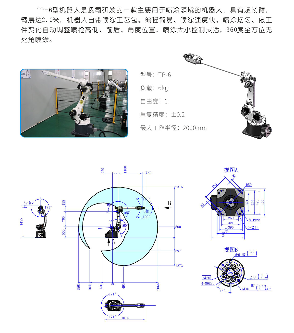 TP-6 robot is mainly used in the spraying, which has an ultra-long arm of 2.0 meters. This robot with a spraying technology package has the characteristics of simple programming, fast spraying and uniform spraying. Depending on the work piece, the robot can adjust the spray gun’s height, front, rear and angle automatically.Spray size can be controlled flexibly, and the spray gun can be sprayed in 360 degrees without dead spots.