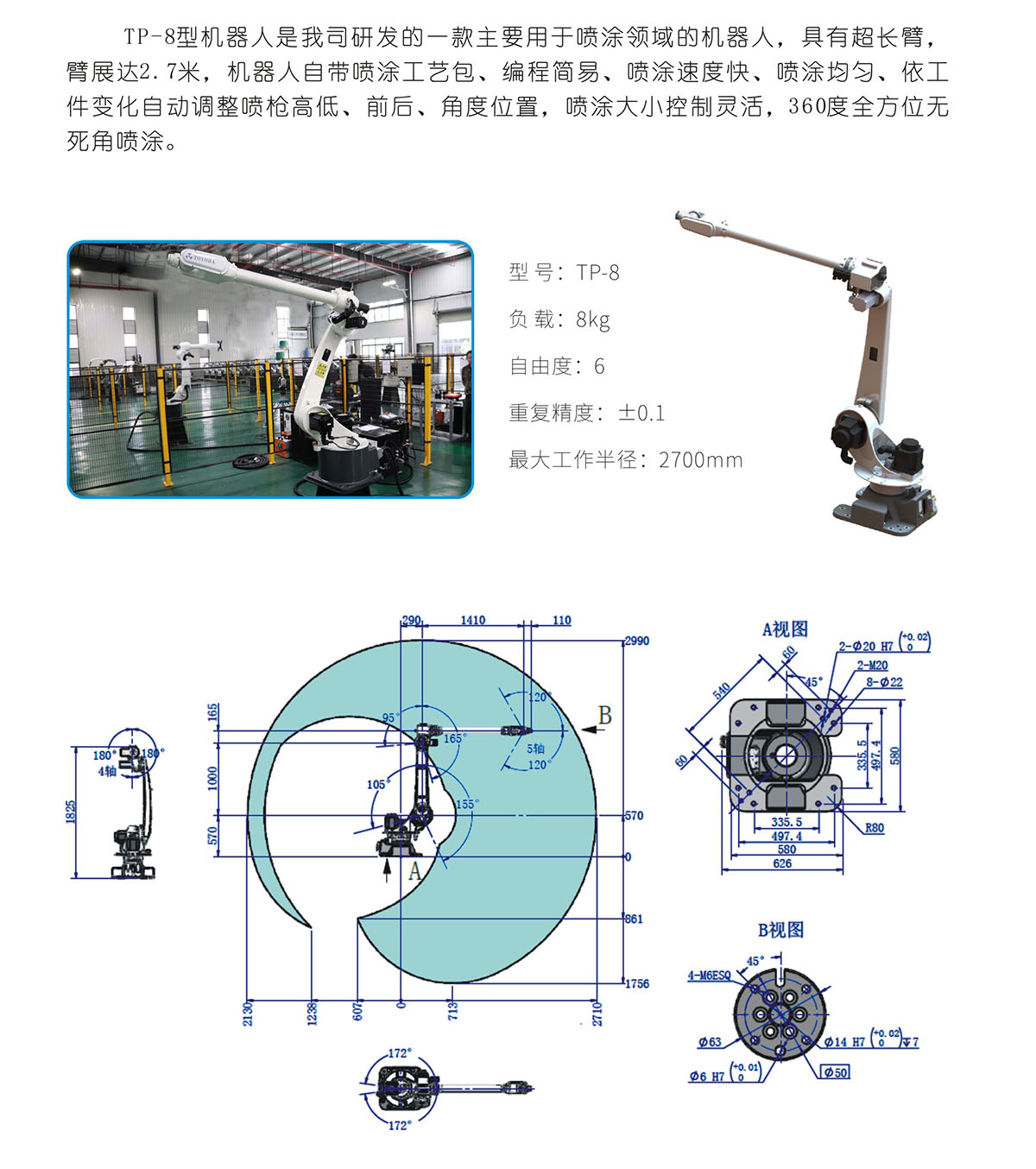 TP-8 robot is mainly used in the spraying, which has an ultra-long arm of 2.7 meters. This robot with a spraying technology package has the characteristics of simple programming, fast spraying and uniform spraying. Depending on the work piece, the robot can adjust the spray gun’s height, front, rear and angle automatically.Spray size can be controlled flexibly, and the spray gun can be sprayed in 360 degrees without dead spots.
