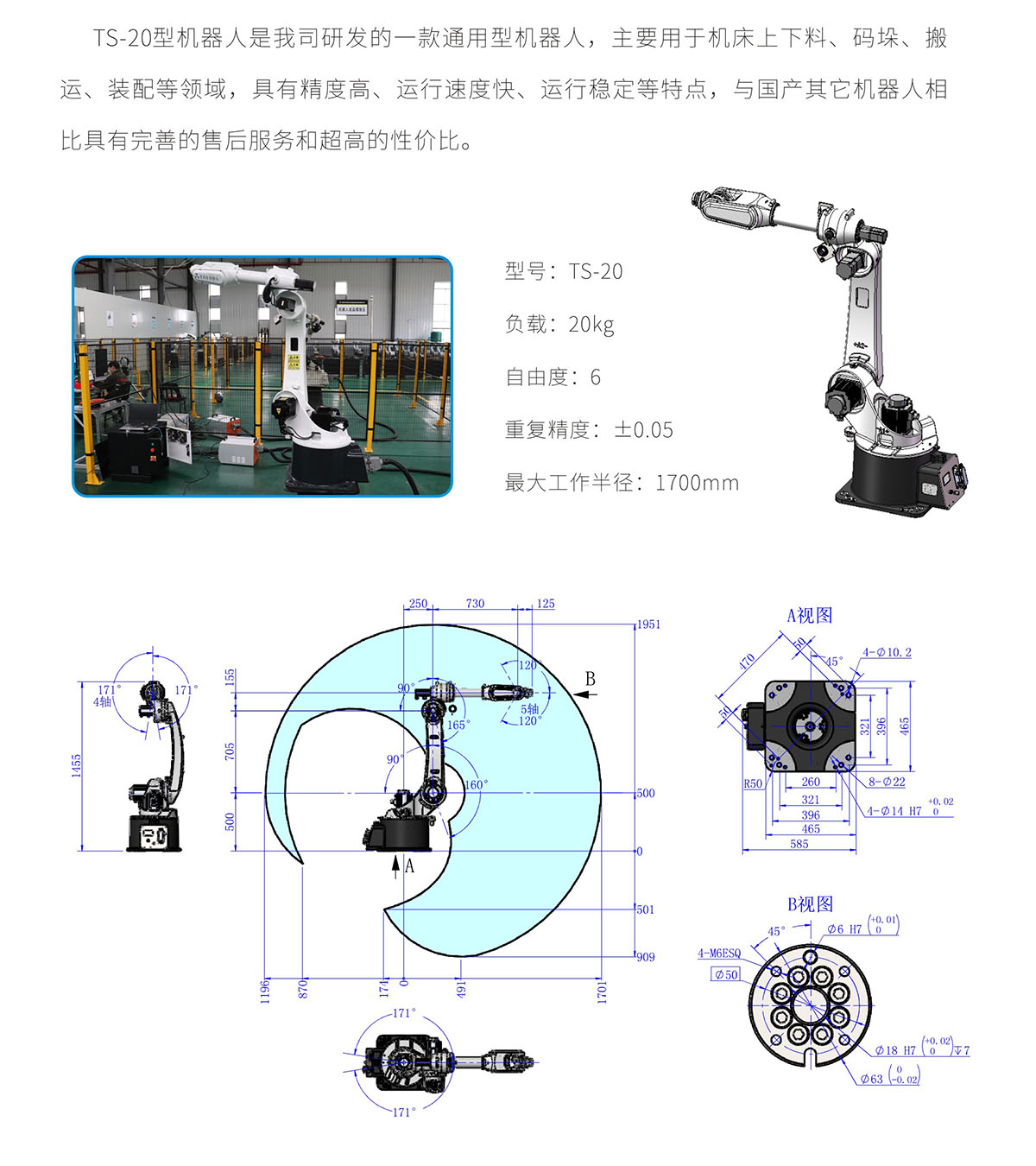 TS-20 robot is a universal robot. It is mainly used for loading and unloading, palletizing, handling, assembly and others. It has the characteristics of high precision, fast running speed and stable operation. Compared with other domestic robots, it has perfect after-sales service and quality.