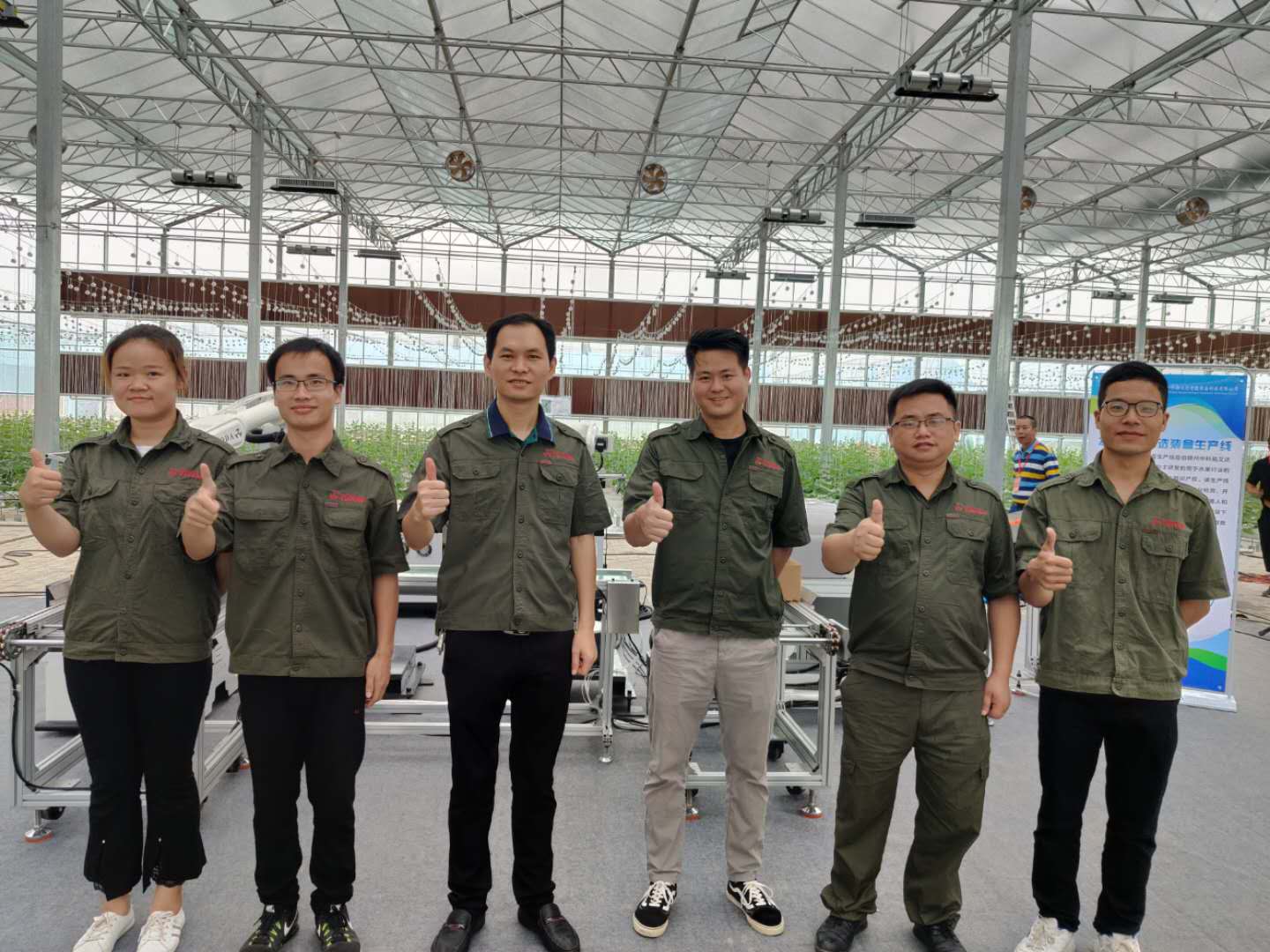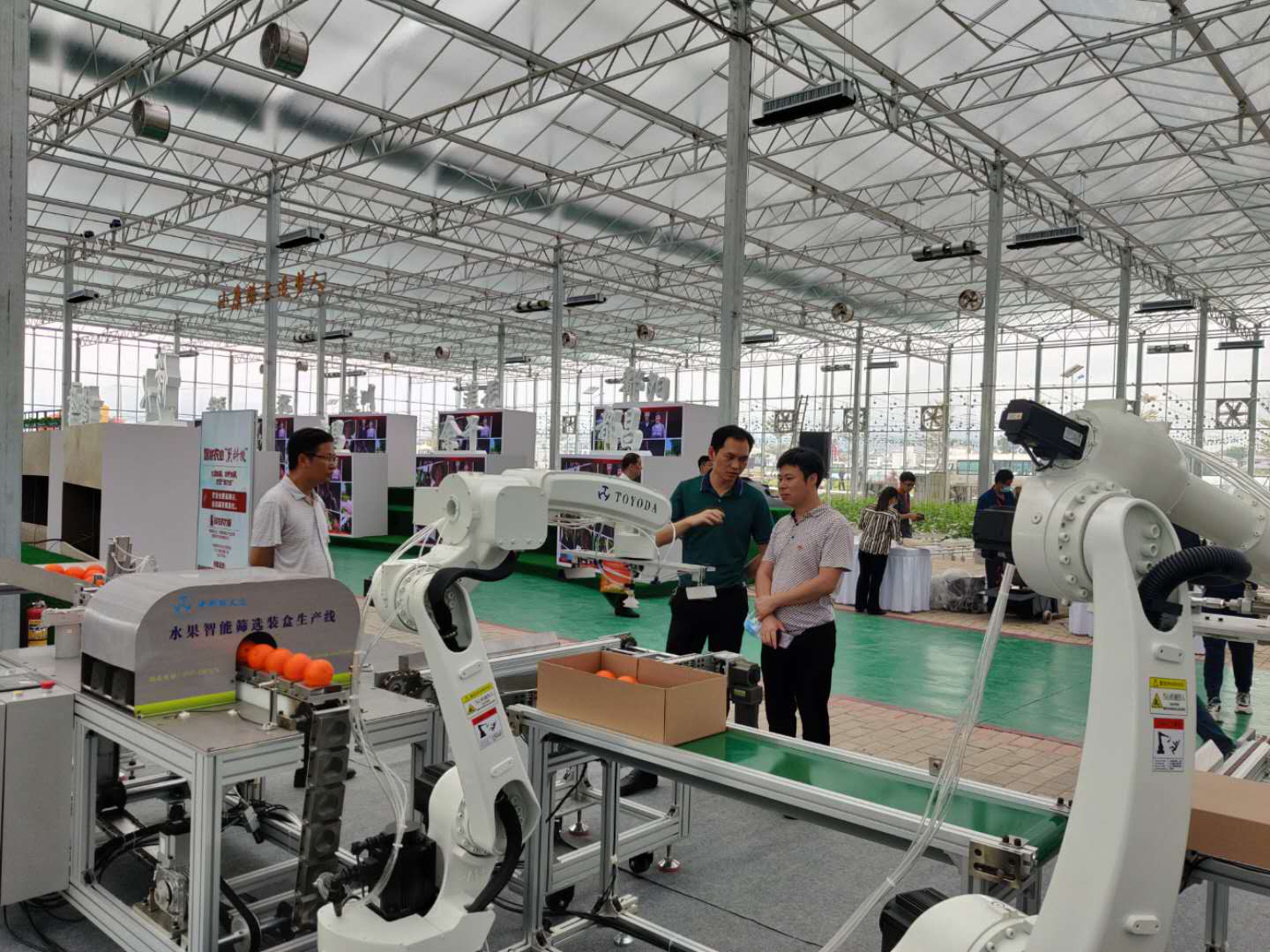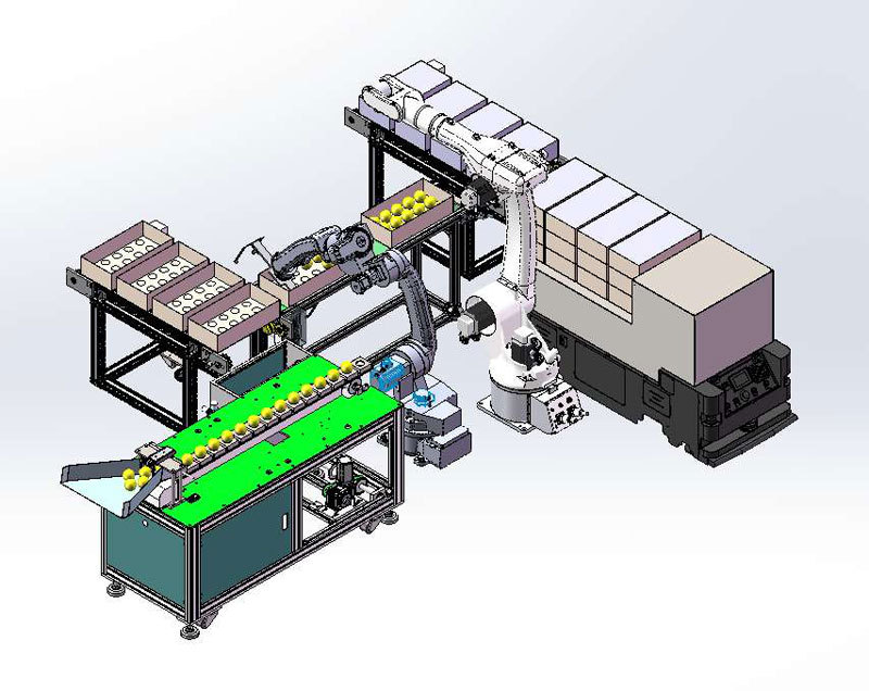 The production line is composed of two parts. The front end mainly realizes the detection of the gloss and sugar content of the fruit, and automatically distinguishes it; the rear end adopts the self-developed six-axis industrial robot and the AGV trolley to realize the automatic packing and palletizing of the fruit. The trolley is directly transported to the warehouse. The whole process realizes unmanned and intelligent production. Once the production line was exhibited, it immediately attracted a large number of news media and visitors, and many audiences took photos with it.